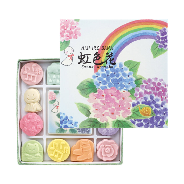ニッコリ笑顔のてるてる坊主に色とりどりの紫陽花が可愛らしい新商品。センターには、『フードプリンター』という技術を使用したカラフルな和三盆が目をひきます。もちろん、和三盆糖の美味しさも健在ですよ!サイズ感もお手頃で、日頃お世話になっている方へのちょっとした贈り物にもいかがでしょうか。