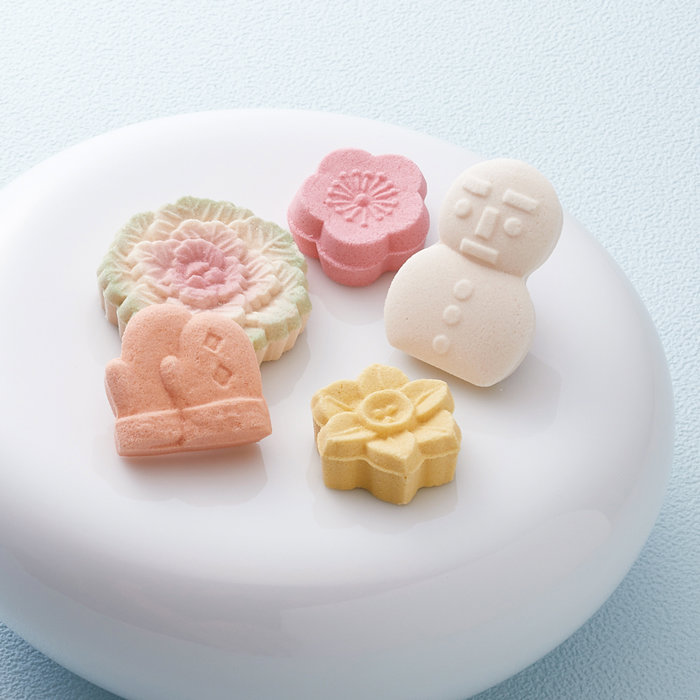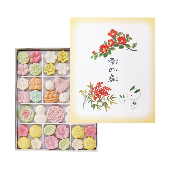 庭に積もった雪がキラキラと輝き、豪華な葉ぼたんや咲き誇る椿からは美しい日本の冬景色が窺えます。まるで雪のようなくちどけをお楽しみください。