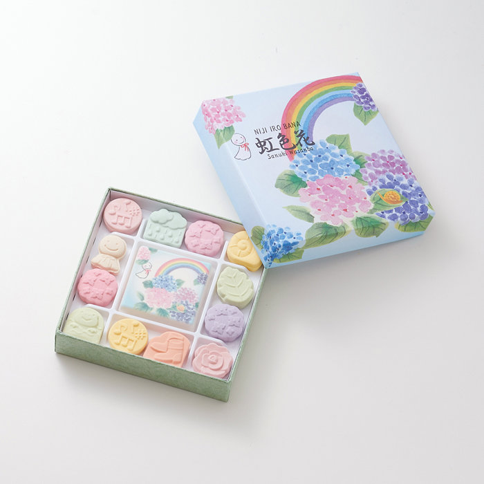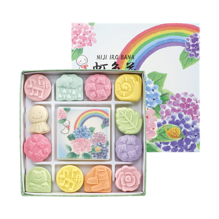日本の梅雨を表現したお干菓子「虹色花」をばいこう堂の焼菓子と一緒に詰合せました。