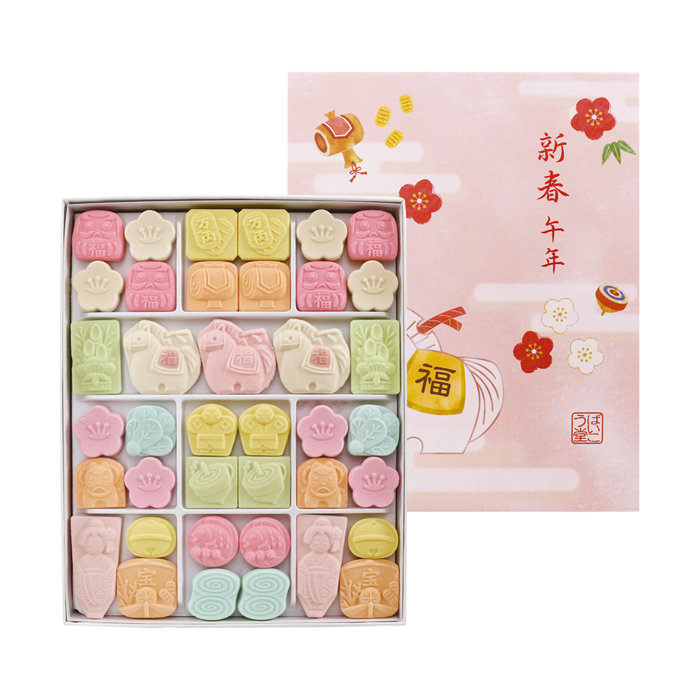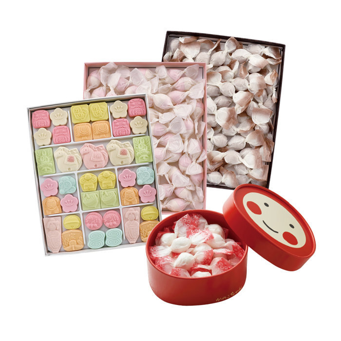 ・新春一段 和三盆糖(香川県製造)、澱粉/着色料(赤3、赤102、赤106、青1、黄4) ・くす玉一段 和三盆糖(香川県製造)/着色(赤3、赤106) ・ちょこれいとわさんぼん一段 和三盆糖(香川県製造)、ココアパウダー ・かのこちゃん 和三盆糖(香川県製造) |
